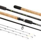 Le blank de cette Green Arrow 360 90-140g est noir mat. Il est assez épais à la base de la poignée car c'est un modèle puissant, permettant de lancer de gros feeders bien plombés ou des cages remplies d'amorce assez lourdes. Cette canne est destinée à la pêche des grosses brèmes et surtout carpes et carpeaux. Le blank est fabriqué à partir d'un carbone haut module.