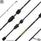 Peu d’information sont disponible sur la composition du blank, on peut néanmoins constater qu’il s’ agit d’un carbone haut module dont l’enroulement des nappes a permis d’avoir une puissance de talon surprenante pour une canne si fine alors que le scion est extrêmement souple. Ce blank est très discret, sa couleur noir mat avec quelques liserés jaunes n’envoie pas de reflets et permet des approches sur des poissons méfiants comme les chevesnes. Son action moderate fast qu’on pourrait traduire par parabolique est en fait plus complexe puisque le blank travaille sur toute sa longueur avec une prise, quelle que soit sa taille, mais à vide, seul le tiers supérieur travaille. On peut donc propulser de petits leurres avec souplesse et utiliser de plus gros sans que la canne ne se comporte en nouille. Ce blank en deux éléments égaux s’emmanche par un spigot de 6 cm de long qui s’emboite sur une longueur de 5cm.