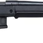 La crosse de cette carabine Remington 700 est réalisée en polymère très résistant. Elle est lisse, avec une finition satinée noire. C'est un modèle tactique du célèbre fabricant américain d'accessoires Magpul qui a été retenu. La crosse possède un système de busc réglable en hauteur. Il existe trois tailles de busc afin de pouvoir s'adapter à la morphologie de chaque tireur. La plaque de couche est épaisse, striée horizontalement afin d'offrir un grip parfait contre la veste de tir. Elle est aussi réglable en hauteur afin de pouvoir adapter la crosse aux différentes positions de tir. La poignée pistolet est assez épaisse, sans trop. Le quadrillage du polymère offre lui aussi une très bonne prise en main, même avec des gants. Le devant est de la même couleur que la crosse. Il est très large et ergonomique. Une grande surface plate assure un équilibre parfait sur un chevalet de tir ou un sac. Des évents sont percés à l'avant afin d'améliorer le refroidissement du canon. La crosse est munie d'un bloc bedding en aluminium afin que le contact entre le boitier de culasse et la crosse soit parfait.