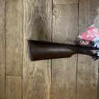 La crosse anglaise et le devant sont en noyer noir américain, ils arborent des quadrillages classiques, dessinés avec soin, ils sont très précis et bien finis. Les bois reçoivent un beau poncé huilé qui donne un aspect très élégant à cette carabine. Cette crosse droite mesure 35 cm de la queue de détente à l’extrémité du sabot amortisseur ; le devant est légèrement dodu et très agréable à prendre en main. Elle est dotée d’une plaque de couche noire que recouverte d’un coussin en matière caoutchouc d’une épaisseur de 1 cm. Celui-ci est perforé pour donner accès avis de la plaque de couche. Crosse et devant sont dotés de deux porte grenadières.