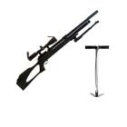 Contrairement aux carabines à air « traditionnelles », dont le canon se casse et s’abaisse afin de comprimer un piston ou un ressort, qui va ensuite propulser l’air contenu devant le piston dans le canon, sur les modèles à air pré-comprimé il faut pressuriser de l’air dans un tube. Pour cela vous pouvez utiliser une pompe à main, une bouteille d’air de type plongée ou un compresseur prévu pour le tir à air comprimé. Le cylindre est situé sous le canon de cette carabine M25. Il est équipé d’un manomètre incorporé. Il faut le remplir à une pression de 200 bars indiquée par une zone verte. L’autonomie est donnée pour 40 coups en calibre 5,5 mm.