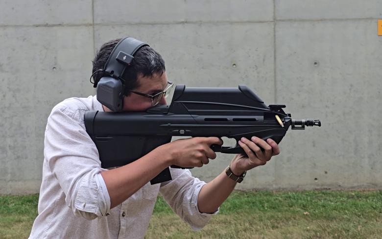Une fois l’arme en main, le FN F2000 se révèle globalement ergonomique. Les commandes sont bien positionnées et accessibles, et la compacité inhérente à sa configuration bullpup se fait immédiatement ressentir. L’insertion des chargeurs s’effectue sans difficulté particulière ; il convient toutefois de souligner que l’arme est exclusivement compatible avec les chargeurs de type STANAG.