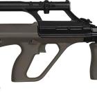Introduite en 1977 sous le nom de StG 77 par l’armée autrichienne, l’AUG se démarque également par son optique intégrée offrant un grossissement de 1,5x, une avancée notable à l’époque. Construit majoritairement en polymère – du boîtier de culasse au groupe de détente –, le fusil se révèle léger et résistant. Autre particularité : l’absence de sélecteur de tir classique, remplacé par une détente progressive où un appui léger déclenche un tir semi-automatique et un appui complet active le mode automatique.