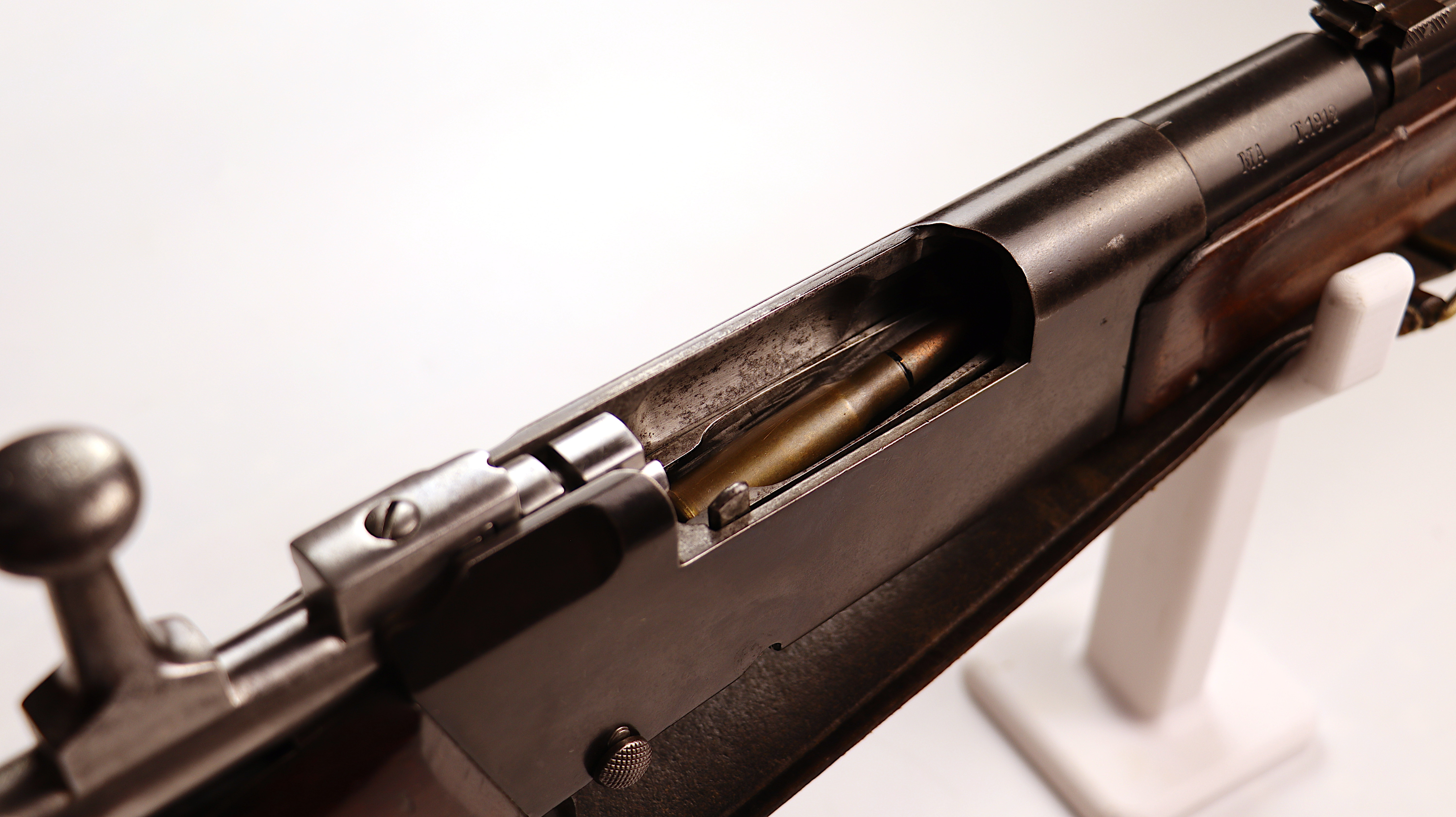 Comme précédemment indiqué, le fusil Mle 1886 dispose d’un magasin tubulaire. Pour l’alimenter, il faut simplement ouvrir la culasse et baisser l’auget avec votre pouce. Un petit clic caractéristique se fera entendre et vous aurez alors accès au tube. Il suffit ensuite d’insérer les cartouches une à une tout en n’oubliant pas que le ressort du magasin à une centaine d'années et qu’il peut vite fatiguer au-delà de 5 cartouches. Une fois la dernière cartouche insérée dans le magasin, si vous refermez votre culasse il n’y aura aucune cartouche de chambrée puisque la dernière se trouve encore dans le tube. Il y a un petit coup à prendre mais en théorie il faudrait mettre votre dernière cartouche dans l’auget plutôt que le magasin, et avec un coup sec sur la culasse vers l’arrière, vous faites remonter l’auget donc la cartouche au niveau de la chambre. Parce que : oui, les cartouches ne vont pas remonter toutes seules au niveau de la chambre, c’est bien la culasse qui actionne l’auget et ce par un mouvement sec et court vers l’arrière. Inutile de forcer, il faut juste que le geste soit vigoureux. Vous aurez alors le plaisir de ‘sentir’ l’auget remonter, et lorsque vous allez chambrer la cartouche, l’auget va redescendre tout seul pour faire sortir une nouvelle cartouche du tube et ‘préparer’ la montée au niveau de la chambre. C’est évidemment plus facile à montrer en vrai qu’à écrire sur le papier et lorsqu’on manipule le fusil on sent réellement l’auget descendre et récupérer une cartouche du magasin, ce qui est réellement plaisant.