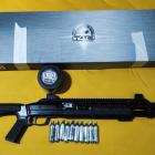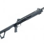 La crosse du SG68 était réglable en longueur, celle du HDX est fixe, mais amovible. Il suffit de presser un bouton sous la crosse et de la tirer en arrière pour la déposer. A l'intérieur on retrouve le tube pressurisé qui va contenir les deux cartouches de CO2 de 12 g installées tête bêche. . Le polymère noir utilisé pour la fabrication de la crosse semble très solide. La poignée pistolet est très droite. Elle comporte un moulage granité en surface pour offrir un bon grip. Le pontet est aussi confectionné en polymère. Il est large et permet de tirer main gantée si besoin. Le devant de l'arme est large, très arrondi et quadrillé pour assurer une bonne prise en main. Il est mobile, monté sur glissière et c'est lui qui va actionner le cycle de rechargement de l'arme. Des attaches de bretelles métalliques sont fixées de part et d'autre du fusil.