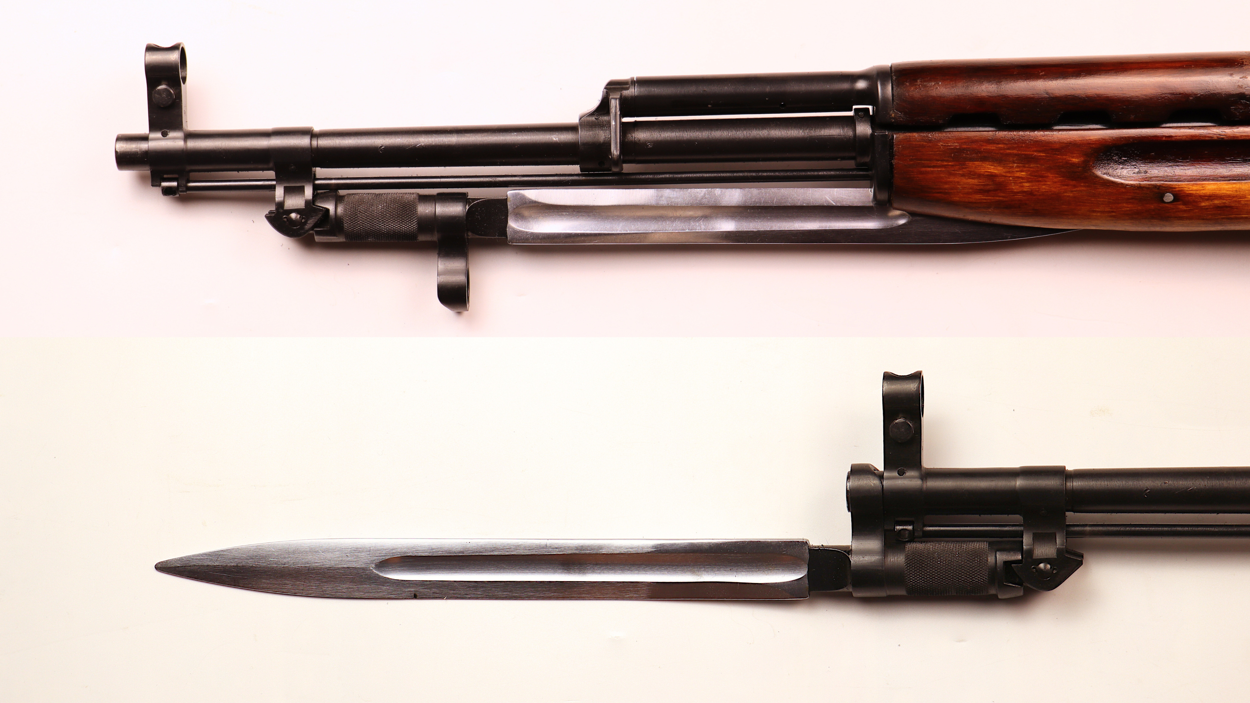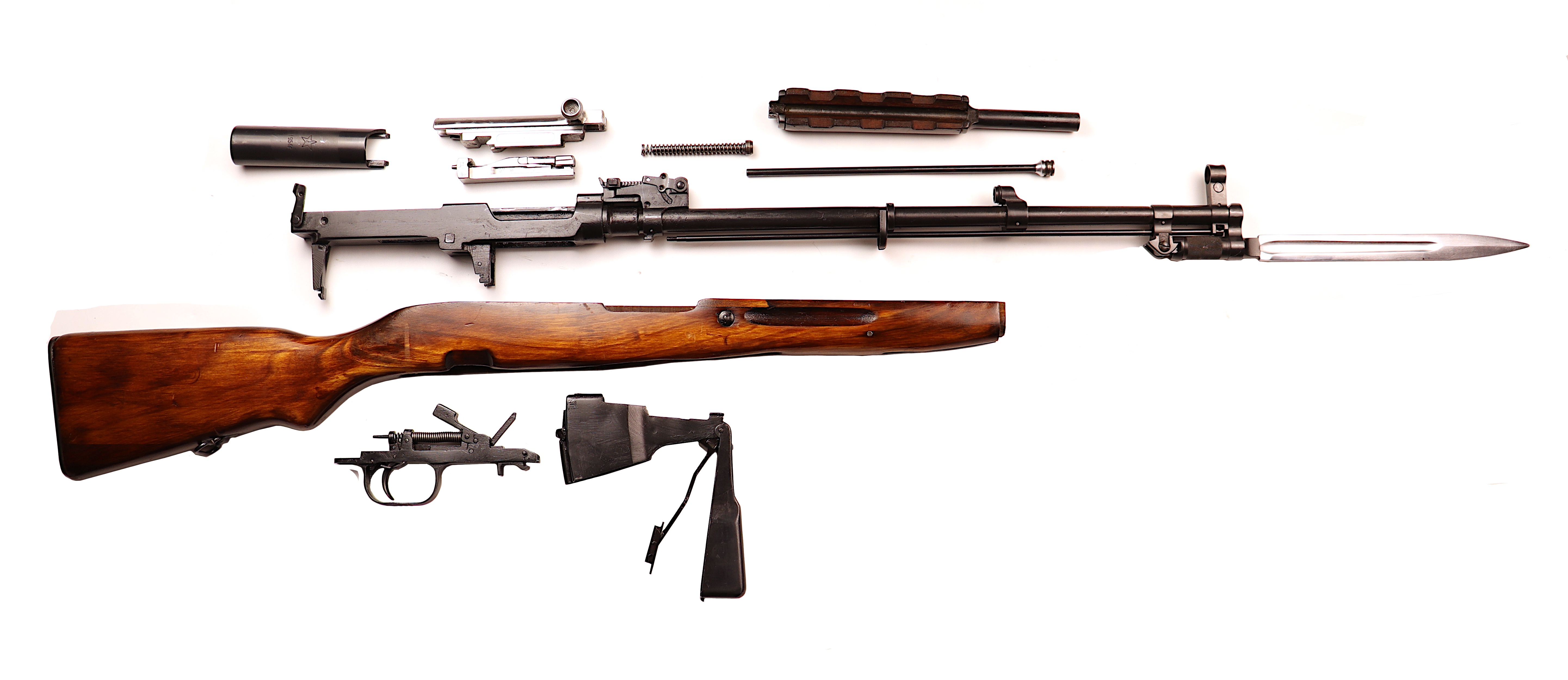 Simonov disposait d’une plus grande expérience dans cette catégorie d’arme et c’est son modèle qui fût validé en 1945, pour être adopté officiellement en 1949. Alors pourquoi ce délai? Et bien la fin de la guerre et des besoins qui changent complètement. La SKS-45 est validée car elle a été pensée pour remplacer l’arme de base du fantassin : il faut qu’elle soit simple à utiliser, à nettoyer, démonter et il faut que l’instruction en soit aussi aisée. C’est pour cela que l’arme revêt certains aspects si “archaïques” comme l’utilisation des lames chargeurs. La population russe de l’époque étant principalement rurale et peu éduquée, le clip s’utilise de la même manière que dans le fusil à verrou Mosin-Nagant. Il n’encombre pas non plus le soldat avec des magasins amovibles, qu’il pourrait perdre plus facilement. Cela en vient même jusqu’à la baïonnette qui se plie sous le canon, pour économiser un fourreau au ceinturon et éviter les pertes. Le démontage (comme vu plus bas) est lui aussi le plus pragmatique possible. C’est une arme pensée pour une utilisation simple pour le fantassin tout en bas de l’échelle, tout en lui permettant de passer au niveau supérieur à savoir le semi-auto.