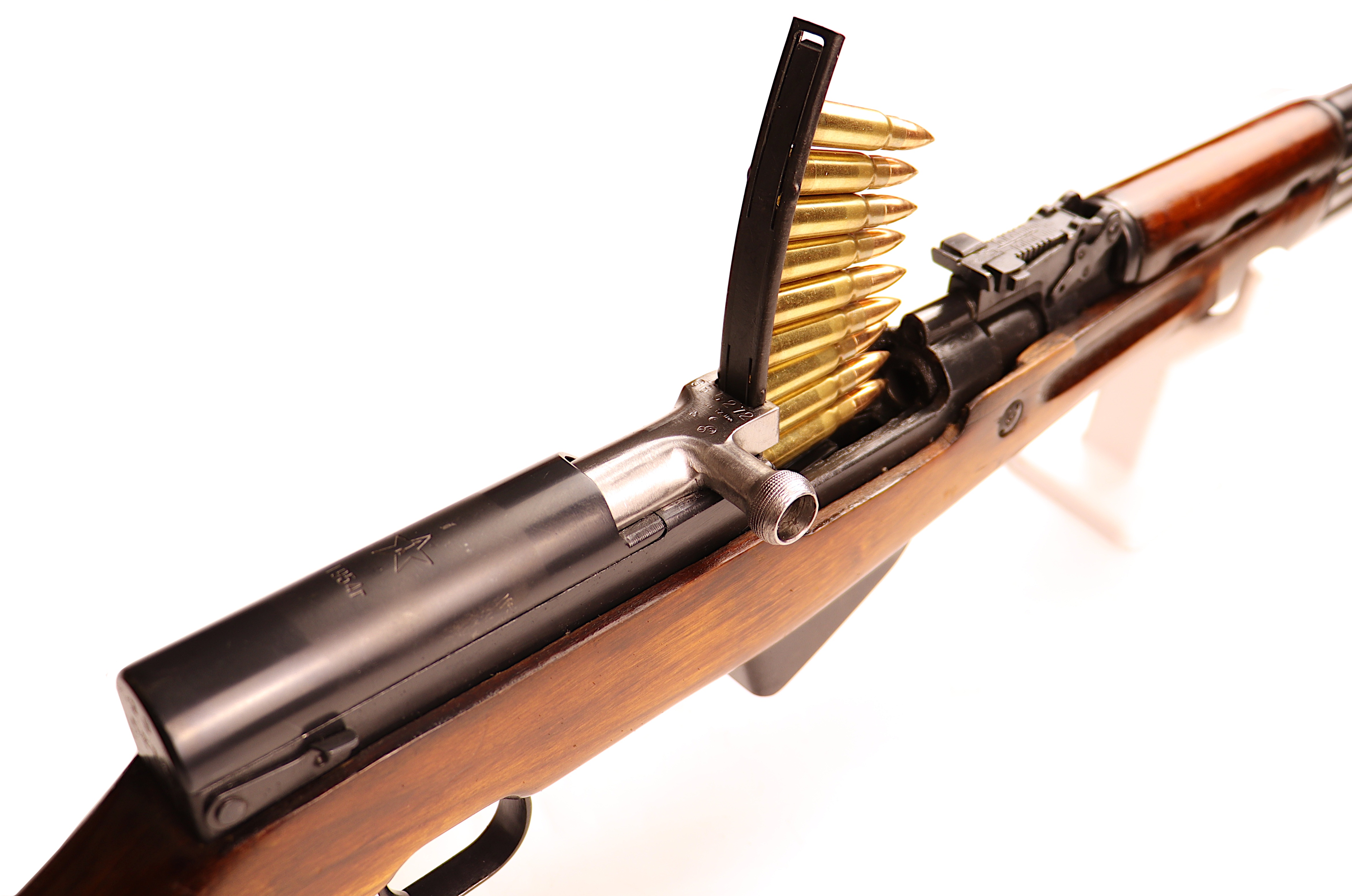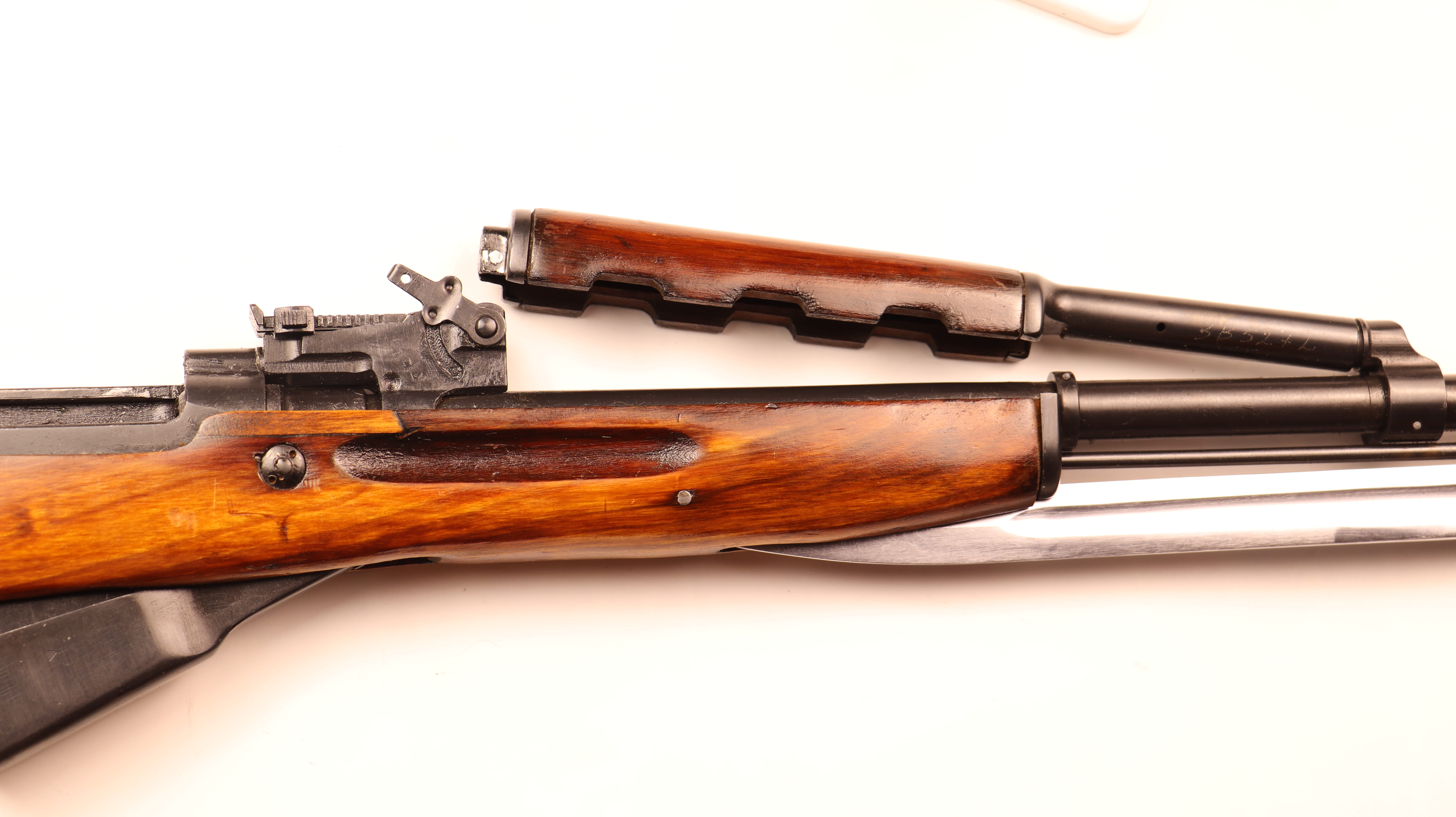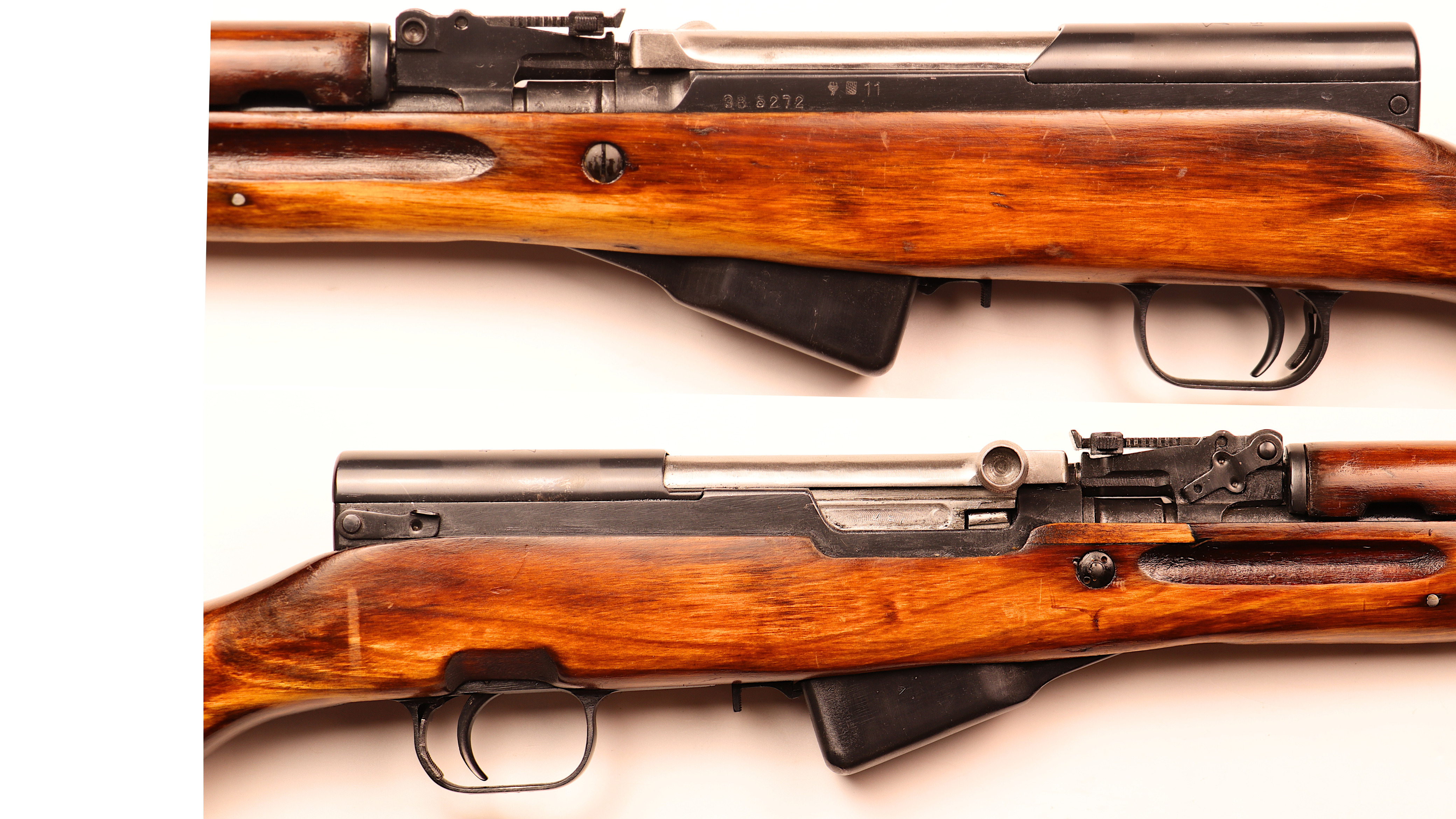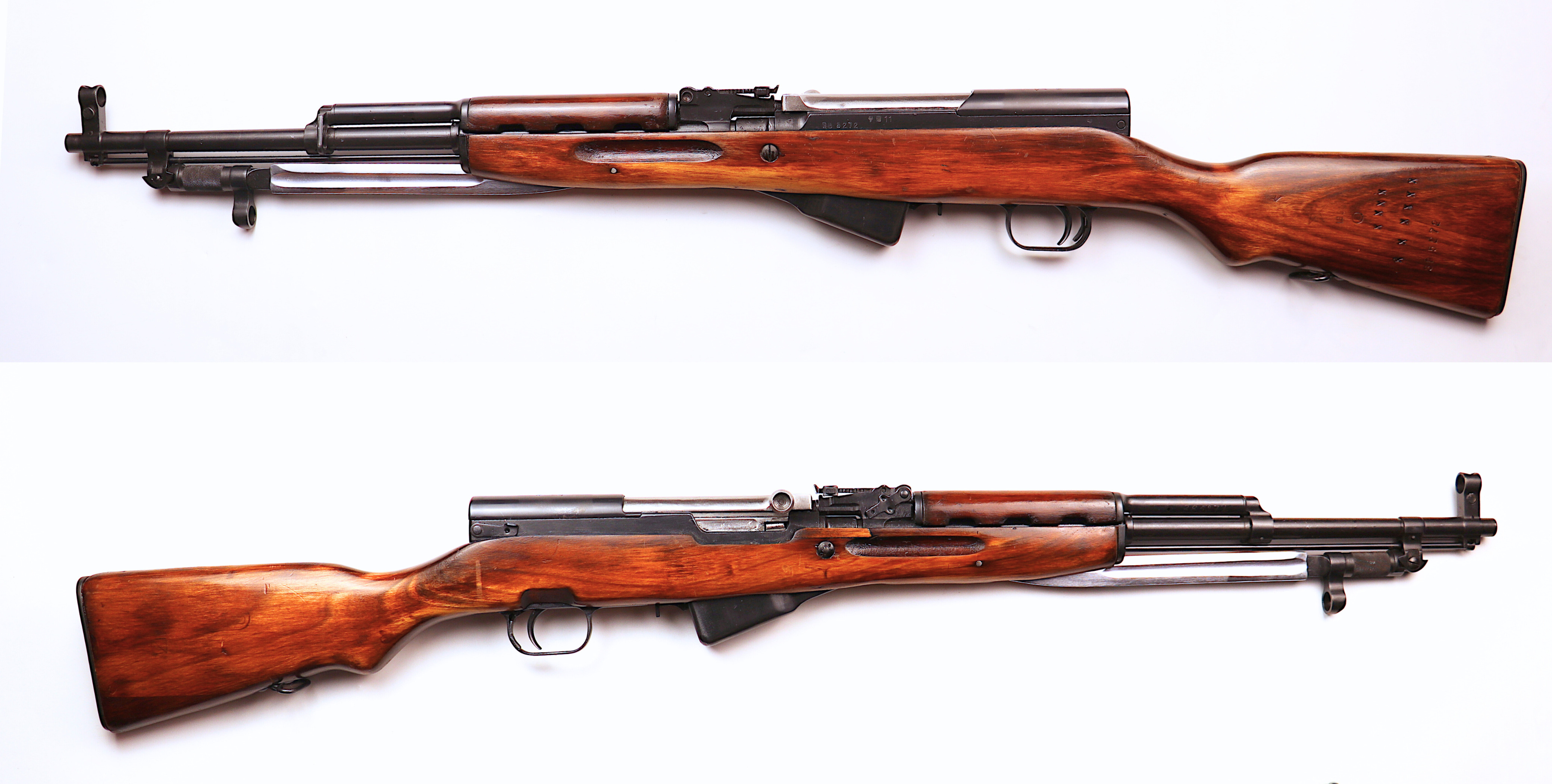 La carabine SKS-45 (pour “Samozaryadny Karabin sistemy Simonova, obrazerts 1945 goda“ soit “Carabine Semi-automatique système Simonov, modèle de l’année 1945”) est une arme semi-automatique soviétique qui chambre le 7,62x39 et est alimentée avec un clip de 10 cartouches. Malgré la date de 1945 dans sa désignation, la SKS n’a en fait pas connu la seconde guerre mondiale car la production a commencé en 1949. Ce qui correspond à la même date de la mise en production de la célèbre AK-47, et il semble alors étrange d’adopter à la fois une carabine semi-automatique, et à la fois un fusil d’assaut, de surcroît dans le même calibre, et pourtant…