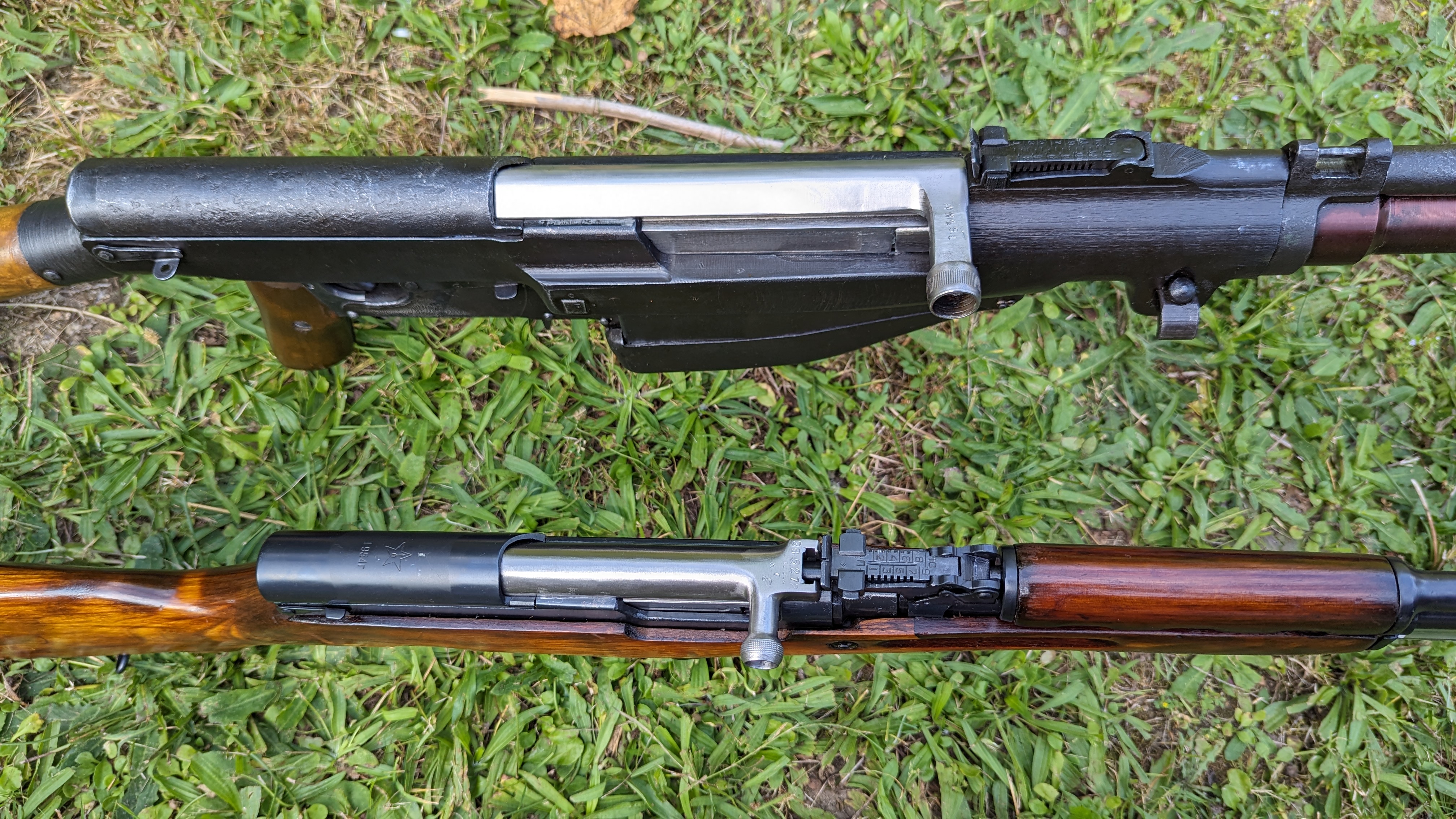 La SKS-45 est l’oeuvre de Sergei Gavrilovich Simonov. Il s’était déjà illustré auparavant dans la conception de l’AVS-36, un fusil automatique chambré en 7,62x54r et tirant en semi ou full auto et produit à partir de 1936. Cependant son arme sera rapidement remplacée par celles d’un autre concurrent (ou camarade…) Fiodor Tokarev avec les SVT-38 et SVT-40. Là où Simonov est plus connu, c’est probablement dans la conception du fusil antichar PTRS41 et chambré dans l’imposante cartouche de 14,5x114 mm. Au milieu du conflit, la Russie développe une cartouche intermédiaire, qui ferait le pont entre les cartouches pour pistolets mitrailleurs de 7,62x25 et les cartouches de fusils 7,62x54r. C’est initialement le 7,62x41 mm qui sera conçu, pour ensuite être encore réduit en 1943 avec la cartouche qui est mondialement connue aujourd’hui le 7,62x39 mm. Il fallait donc développer une nouvelle arme autour de cette cartouche et à ce moment-là, le concept de fusil d’assaut n’était pas très diffusé, c’est donc naturellement vers la carabine semi-automatique que la demande est faite. Simonov, ainsi que d’autres armuriers comme Degtyarev ou le jeune Kalashnikov proposeront leurs inventions. Pour Simonov l’idée fût “simple”: reprendre le PTRS 41 comme base et l’adapter à la cartouche intermédiaire M43 et il est vrai que lorsqu’on regarde les deux armes côte à côte, les ressemblance sont frappantes!