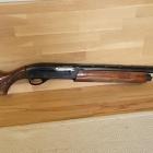 La crosse et le devant sont réalisés dans un matériau synthétique visiblement très résistant. La crosse sonne un peu creux, comme beaucoup d'armes équipées de crosse en polymère. Un épais sabot amortisseur de 2,8 cm équipe ce fusil. Il est correctement ajusté mais s'ouvre un peu lorsqu'on le pousse sur les bords. Il est orné d'un marquage Remington très sobre sur ses flancs. L'arrière de la crosse synthétique n'est pas tout à fait lisse, le polymère est légèrement granuleux. Une attache de grenadière est moulée dans la partie arrière de la crosse et plutôt bien intégrée visuellement. La poignée pistolet est assez marquée. Elle est revêtue d'un « quadrillage » imitant un gros cuir. Il est peu marqué et n'offre pas un grip prononcé. La poignée n'est pas très épaisse, un avantage pour les jeunes chasseurs et ceux ayant de petite main. Elle possède un léger renflement au niveau de la paume de la main (elle mesure alors 3,7 cm). Cette crosse mesure 36 cm de l'extrémité du sabot amortisseur jusqu'à la queue de détente.