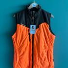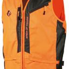 C'est un tissu anti-ronce résistant mais assez souple qui est utilisé pour la confection de ce gilet. Les empiècements vert foncé et orange camouflé sont bien assemblés. Il n'y a bien sûr pas de membrane imperméable ou coupe-vent. Le tissu est déperlant ce qui vous abrite d'une petite averse et du ruissellement des feuilles suite à la pluie.