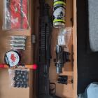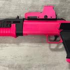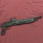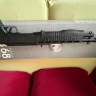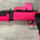 Un long rail Picatinny est fixé par deux vis Alen sur le dessus du boitier. On pourra judicieusement s’en servir pour fixer un petit viseur à point rouge qui améliorera la précision des tirs et va accroitre la rapidité d’acquisition de la cible ! Le devant de l’arme est large, très arrondi, un peu bombé à son extrémité et quadrillé pour assurer une bonne prise en main. Des attaches métalliques de bretelles sont fixées de part et d’autre du lanceur, au-dessus de la queue de détente à l’arrière et sous le canon à l’avant.