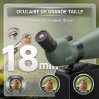 Ce modèle est équipé d'un oculaire de 18 mm de diamètre comportant un grossissement variable de 20 à 60x. Comme sur la longue vue SV13 que j'avais testé à 20 x l'image est assez nette et plutôt lumineuse. A 30 x les détails sont encore nets. L'écorce d'un arbre par exemple à 100 mètres de distance comporte de nombreux détails. A 40x les détails sont encore bien visibles mais on perd en qualité. A 60x on voit encore distinctement mais les détails sont moins nets.