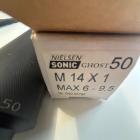 Le Ghost 50 de Nielsen Sonic se visse bien sûr à l'extrémité de votre carabine. C'est un modèle manchonné ou coiffant (Over Barrel) qui va donc recouvrir une partie de votre canon. Il ne peut pas être monté si vous avez un guidon fixé un peu en retrait du pas de vis. Le Ghost 50 mesure 25 cm de longueur mais n'ajoute à votre canon que 14 cm de longueur, les 11 autres centimètres recouvrent le bout de votre arme. C'est intéressant car une fois encore cela procure un espace vaste, idéal pour les calibres magnum et va limiter l'allongement de l'arme et donc réduire sa maniabilité et son équilibre. Une bague en polymère entoure le canon. Elle possède un diamètre interne de 17 mm et doit être mise aux côtes de votre canon avec soin afin de ne pas risquer de forcer sur le pas de vis lors de la pose et la dépose du modérateur de son. Le Ghost 50 est disponible dans les pas de filetage suivant : M14x1 ; M15x1 ; M17x1 ; M18x1 et 5/8x24. Il vous faut bien sûr connaitre le pas de filetage de votre arme avant toute commande ! Une bague en polymère est livrée dans le carton et permet de vérifier que c'est le bon pas de filetage. Elle peut recouvrir l'extrémité du canon lorsque vous n'avez pas le modérateur monté.