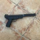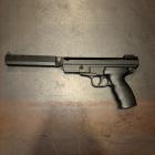 Elle est très bien finie, sans trace de moulures, ni aspérités. On est loin de la taille et du poids du vrai Buck Mark en 22 lr. Là, la poignée est assez grosse, il faut une bonne main pour le tenir. Le pistolet pèse 1367 g sur la balance et mesure 40 cm de longueur. Le tenir à bout de bras demande un peu de force, mais comme la carcasse est longue on peut le tenir à deux mains sans souci.