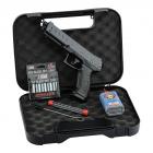 Il est livré dans une boite en ABS plutôt sympa et qui contient tout le nécessaire pour le faire fonctionner, des cartouches de 12 g de CO2 et deux petits tubes de billes caoutchouc. Dès la sortie de la boite la prise en main est bonne, la taille rappelle vraiment un pistolet, Il est même plus réaliste que ses concurrents.