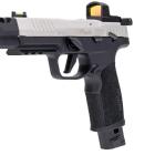 Il mesure donc 5'' de long soit 12,7 cm et il est rayé bien entendu. Nous avons testé cette arme en calibre 9x19 mm qui a l'avantage d'être assez économique. C'est parfait pour les disciplines de tir sportif qui lui sont dédiées, IPSC notamment.
