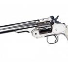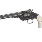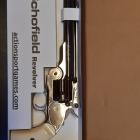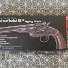 En introduction, revenons rapidement sur l’origine de ce révolver et de son nom ! Le Major George SCHOFIELD de l'US ARMY inventa ce mécanisme d’ouverture en 1875. Il dessina un verrou supérieur qui permet d’ouvrir le revolver d’une seule main et de basculer l’ensemble canon et barillet (mécanisme top break). Ces deux pièces étant solidaires, elles plongent vers l’avant lorsque l’on tire sur le verrou ce qui donne un accès aisé aux six cartouches contenues dans le barillet. Il y a même un extracteur automatique qui soulève les cartouches hors des chambres du barillet et facilite le rechargement de l’arme. C’est idéal pour les cavaliers et soldats de l’époque et qui n’avaient souvent qu’une seule main de disponible ! Ce révolver connut rapidement un grand succès et fut fabriqué par Smith&Wesson sous le nom de modèle 3 Schofield.