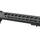 Le garde-main présente un fond plat avec les attaches Mlock et ARCA. Ce dernier est récent sur le marché. Le fond plat permet de faire glisser rapidement un équipement, comme un bipied, sur toute la surface du rail. Quand la position souhaitée est bonne, le blocage est immédiat. En l’absence d’équipement, cette surface plate permet une meilleure stabilité de l’arme si elle est posée sur un sac. Les autres faces offrent des slots Mlok.