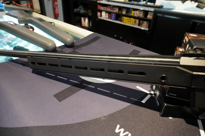Sous la crosse, la présence d’un rail M-LOK autorise le montage d’un monopod ou d’autres accessoires utiles en tir de précision, tandis que Tikka a intégré d’origine un appui ergonomique pour la main faible, particulièrement appréciable en tir posé ou lors des phases de maintien sur appui arrière.