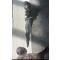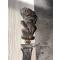 Il est sculpté en bois (ressemble à du bois foncé, possiblement du bois de fer ou d'autres bois durs). La sculpture représente une figure humaine ou mythologique assise, ce qui est courant pour les keris javanais ou balinais, symbolisant souvent un héros ou une divinité. Une bague de garde (Mendak), ornée de ce qui semble être des pierres (ou des imitations de pierres) et de métal doré, sépare la lame du manche.